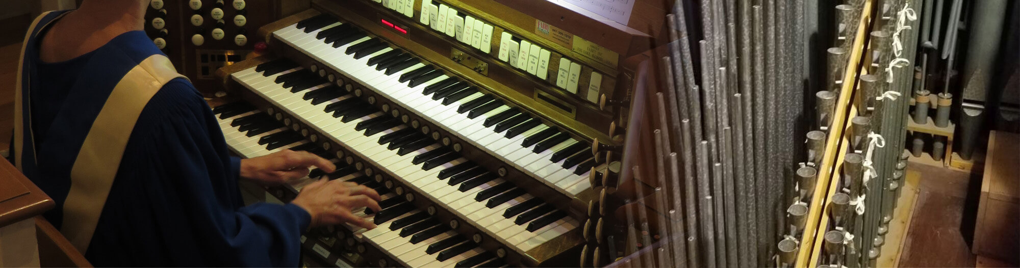 This impressive instrument’s main console and pipes are hidden from view in the sanctuary, with the pipes situated behind faux wall panels and the console set below the floor in the choir loft. A small antiphonal grouping of pipes can be seen by those in the balcony. The M.P. Möller company expanded upon the prior 1954 Reuter organ, bringing it to a total of 2300 pipes in 41 ranks. In 2020, the organ was updated with a digital console. Organist is Rhonda Kwiecien, Director of Music and Keyboard Artist.